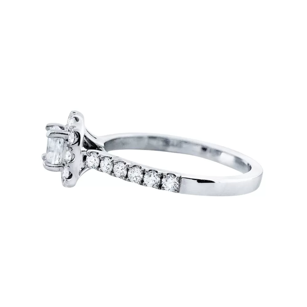 Anillo de Compromiso halo en oro blanco con diamante talla cushion (0.40 ct, color I, pureza VVS2).