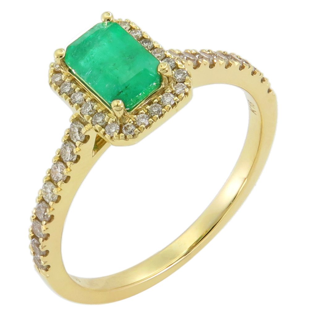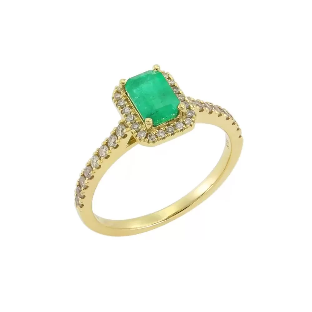 Anillo en oro amarillo con esmeralda talla esmeralda y diamantes talla brillante.