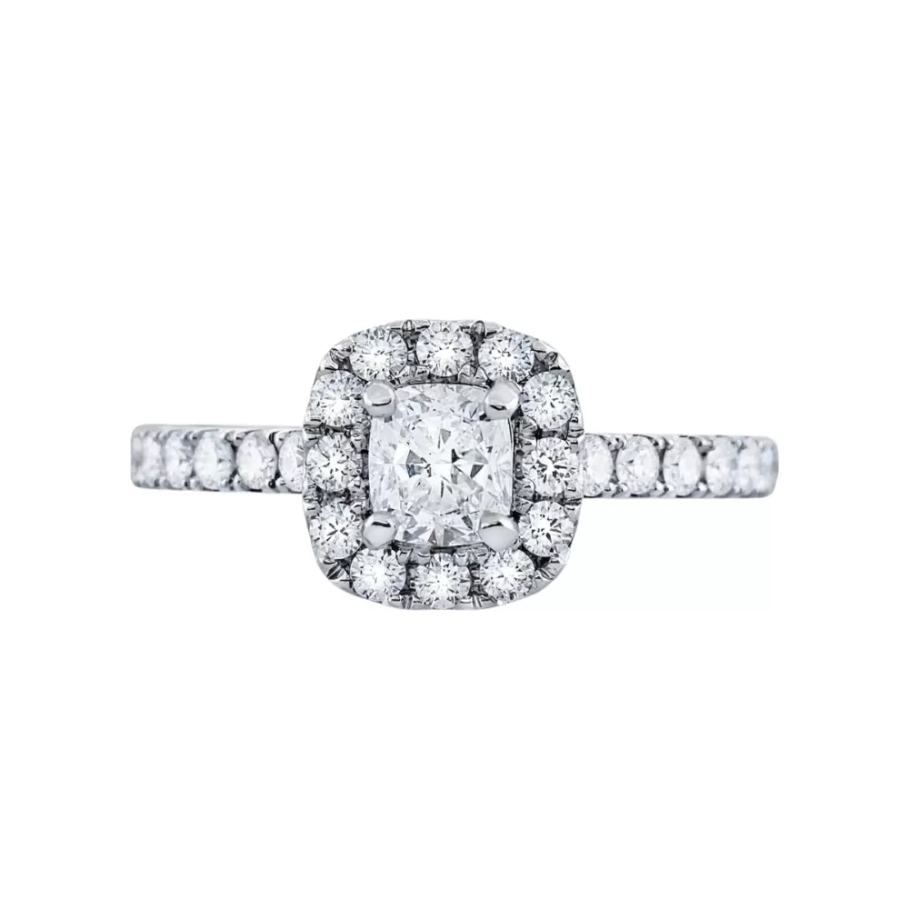 Anillo de compromiso halo en oro blanco con diamantes talla brillante (0.18 ct, color F, pureza VS).