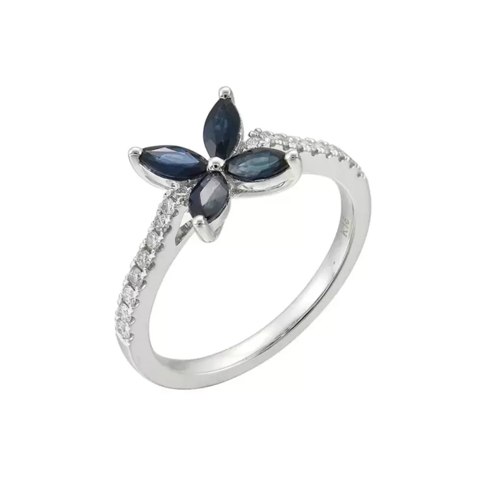 Anillo en oro blanco con zafiros talla marquesa y diamantes talla brillante.
