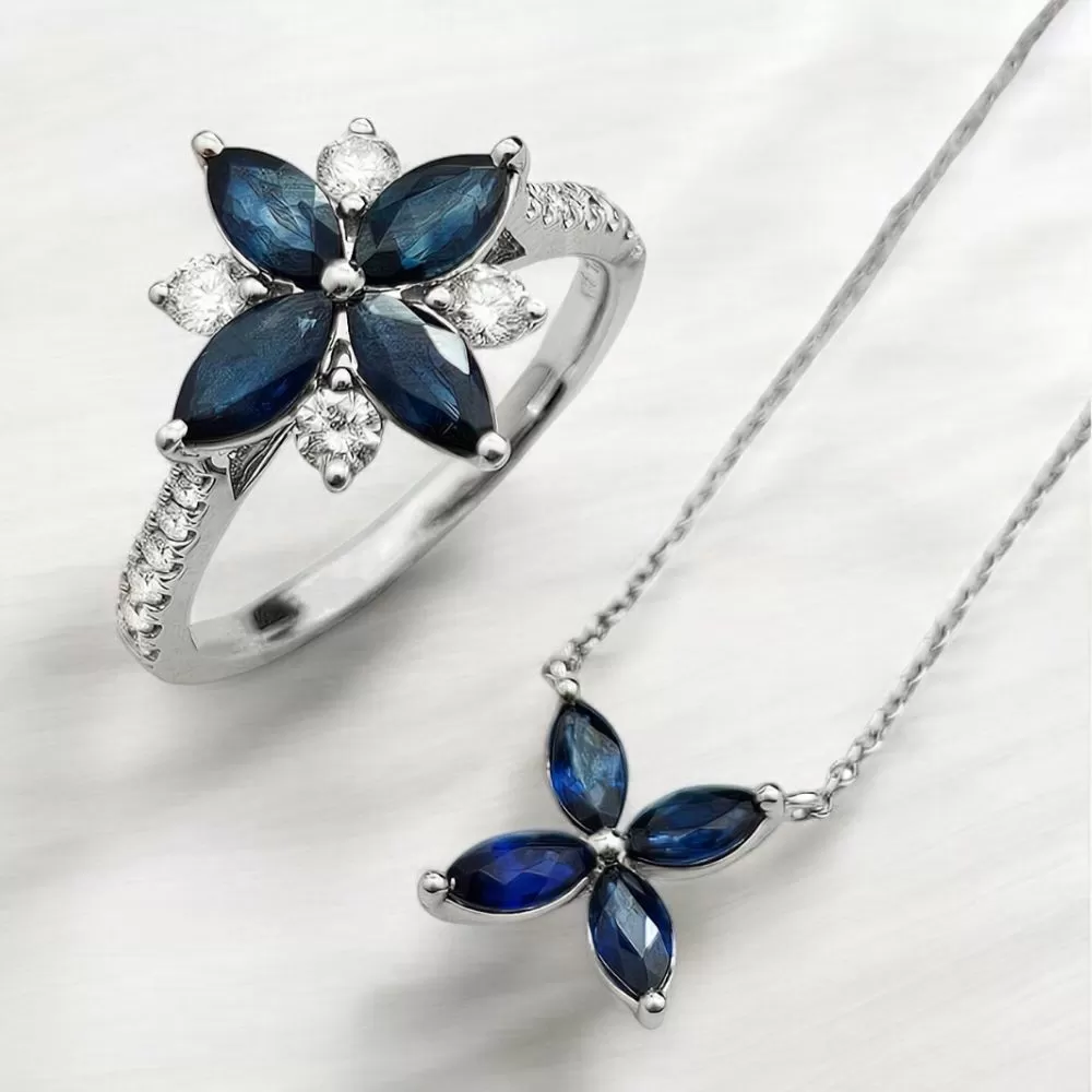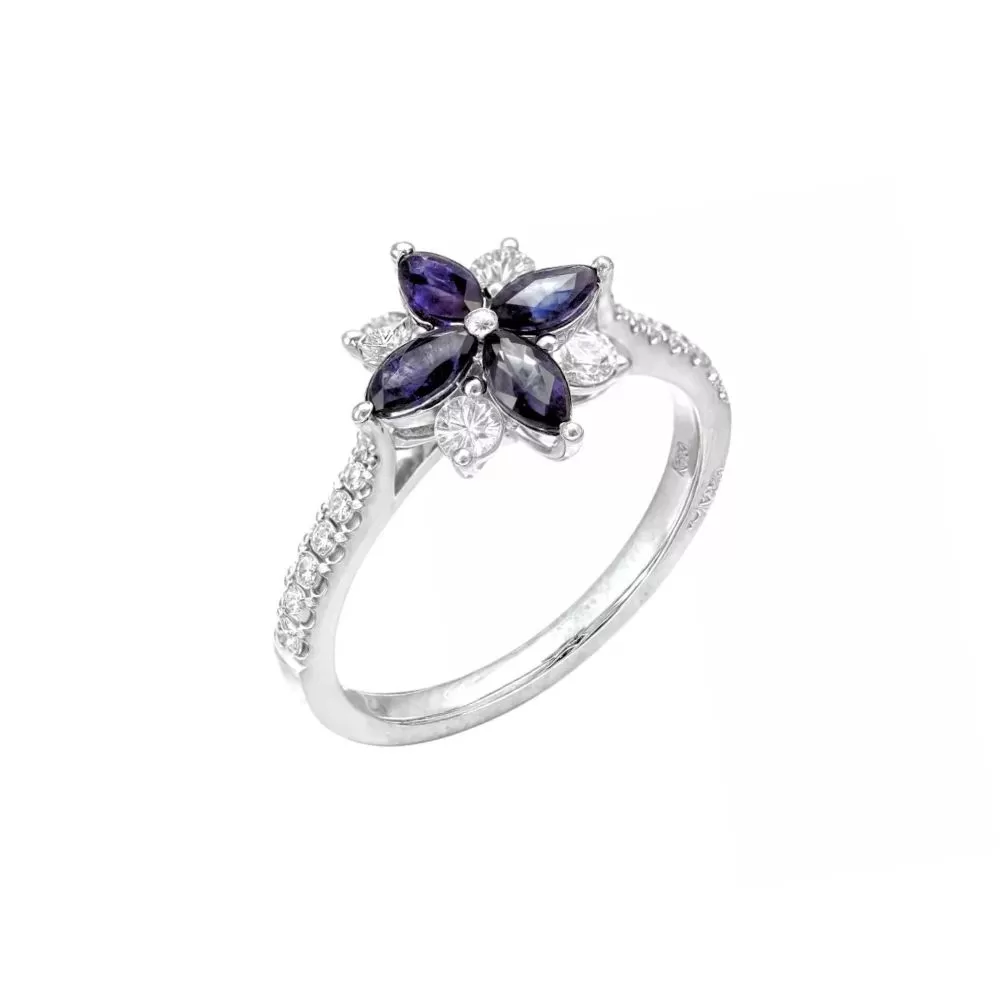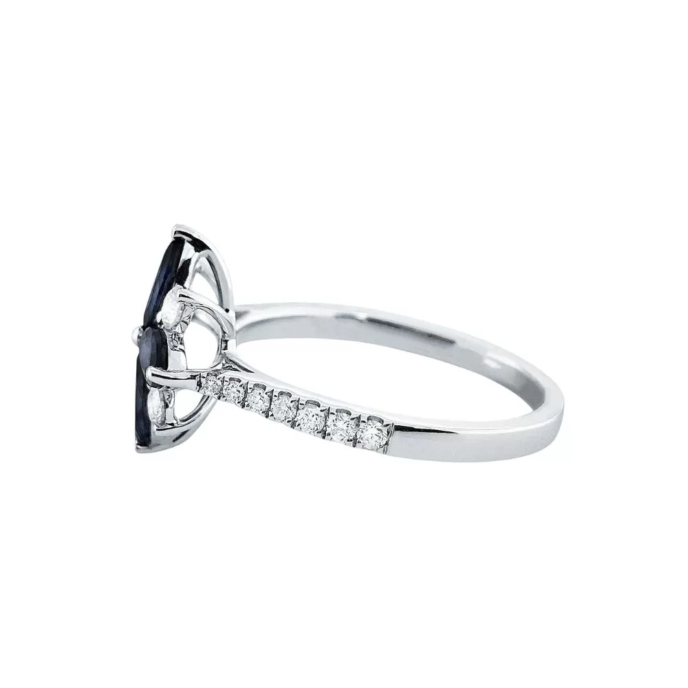 Anillo en oro blanco con zafiros talla marquesa y diamantes talla brillante.