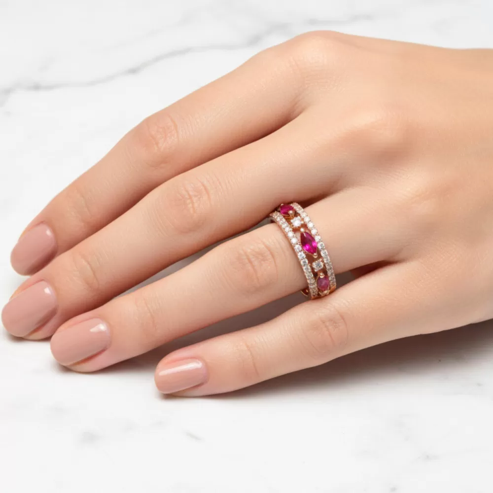 Anillo en oro rosa con rubíes talla marquesa y diamantes talla brillante.