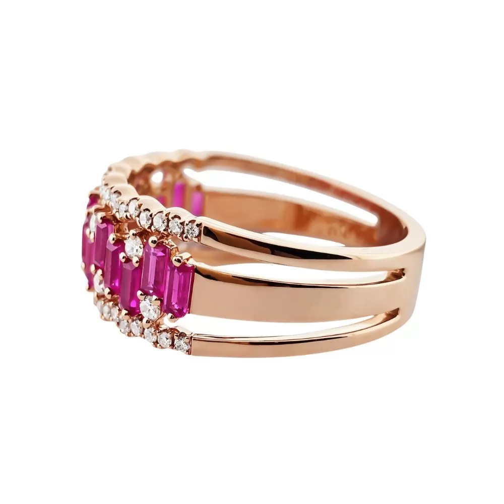 Anillo en oro rosa con zafiros rosas talla baguette y diamantes talla brillante.