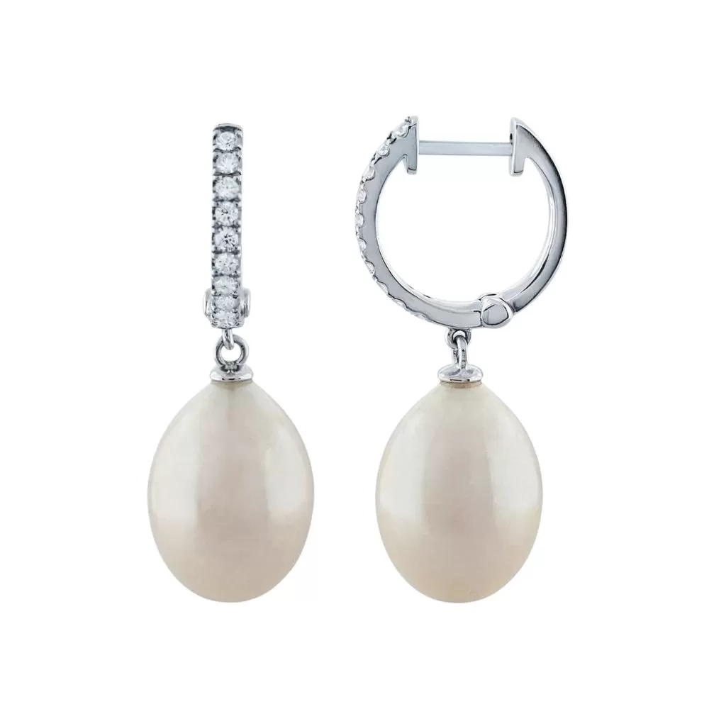 Aros en oro blanco con diamantes talla brillante y perlas de cultivo.
