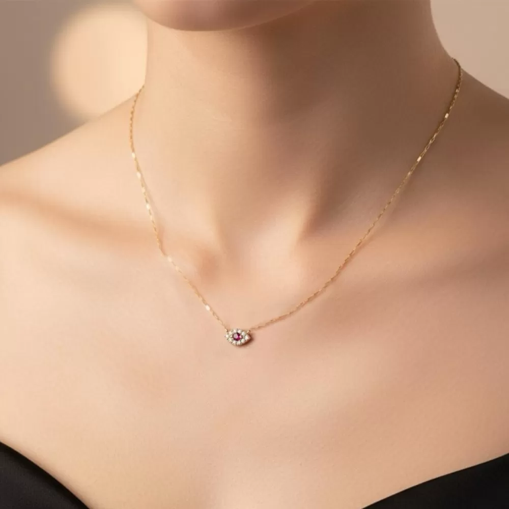 Collar en oro amarillo con rubí talla brillante y diamantes talla brillante.